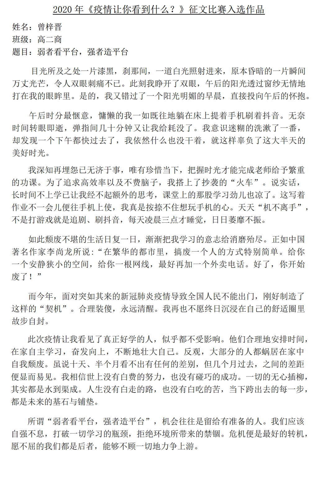 《疫情让你看见什么?》征文比赛入选作品(10,11) 2020年6月1日发布 在漫长的抗疫过程里,本校宣教处举办的《疫情让你看见什么?》征文比赛,获得了同学们热烈的反应,感谢同学们的参与。 【备注:入选作品將于一星期内陆续公布,敬请关注,谢谢。】 今天 01/06/2020 公布的作品,是来自高一理的梁宇慷同学、高二商的曾梓晋同学。 » 点击浏览 27/05/2020 公布的作品:来自初一爱的覃星珲同学、高二理的高婕丝同学 » 点击浏览 28/05/2020 公布的作品:来自初二孝的吴泓欣同学、初三孝的杨曲星同学、高一商一的廖雪晶同学 » 点击浏览 29/05/2020 公布的作品:来自初三孝的高文谏同学、高三理的方翊诠同学 » 点击浏览 30/05/2020 公布的作品:来自初一爱的王垲铮同学、高二理的梁咏恬同学 .入选作品的名单如下:
