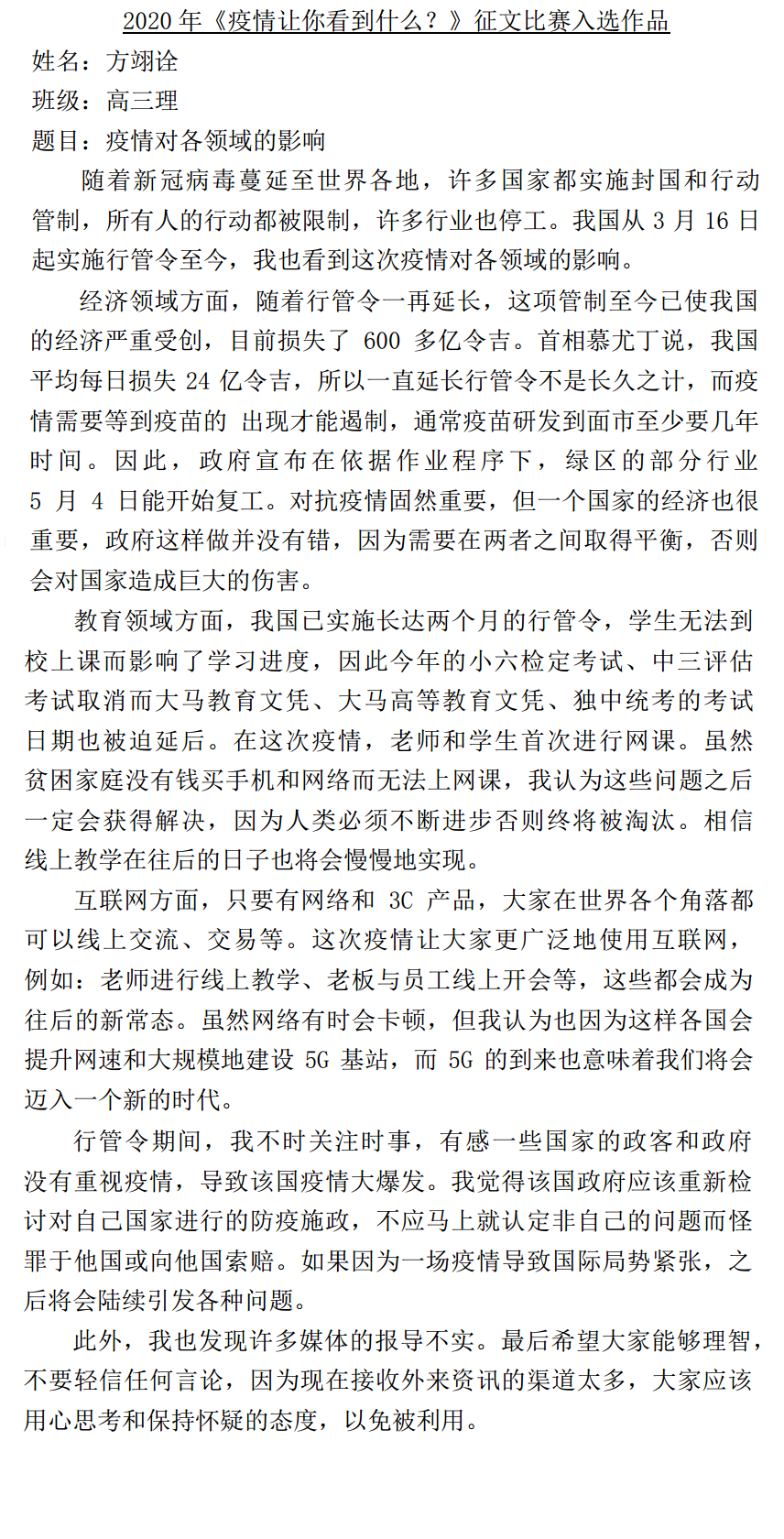 《疫情让你看见什么?》征文比赛成绩揭晓(29/05/2020 附上入选作品6,7)