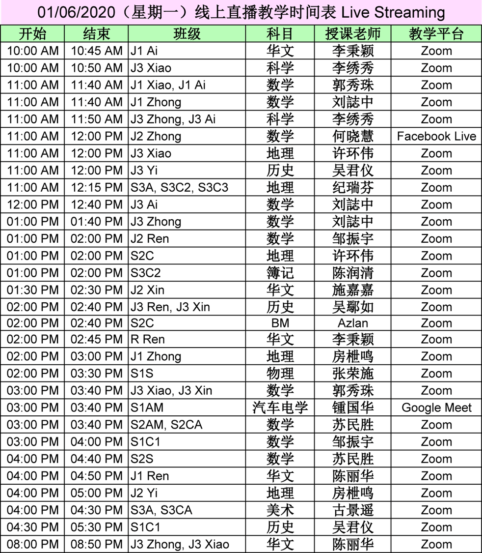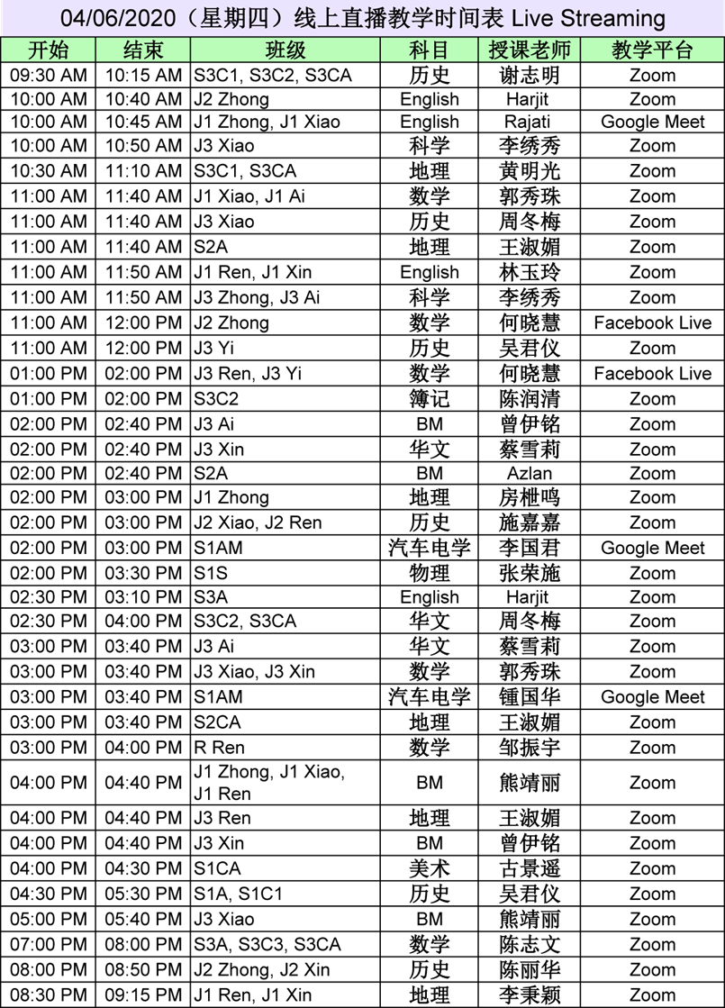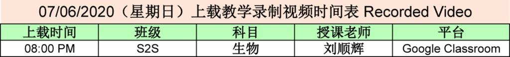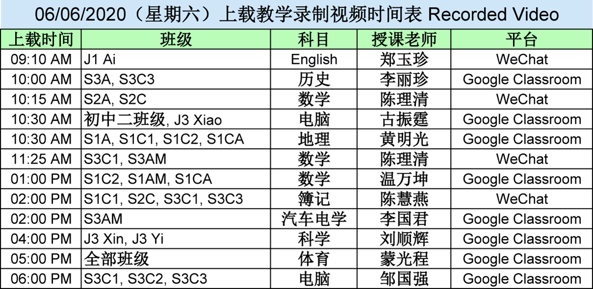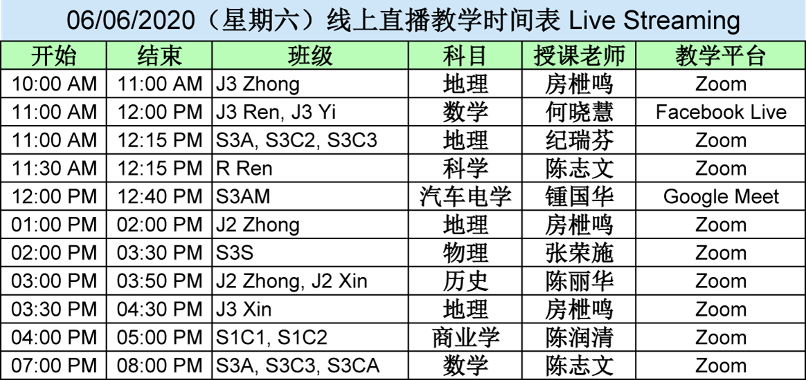 【01.06.2020~07.06.2020】“线上直播教学” 和 “上载教学录制视频” 时间表