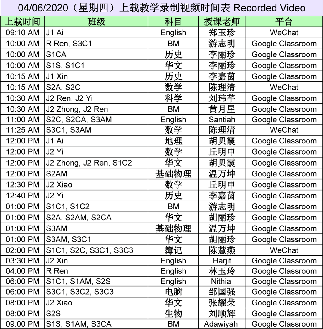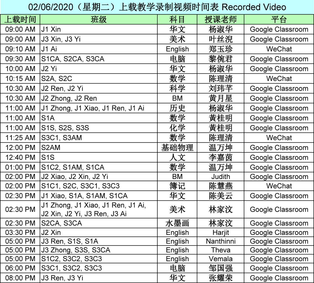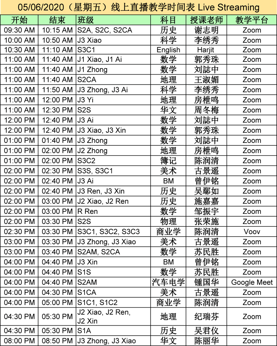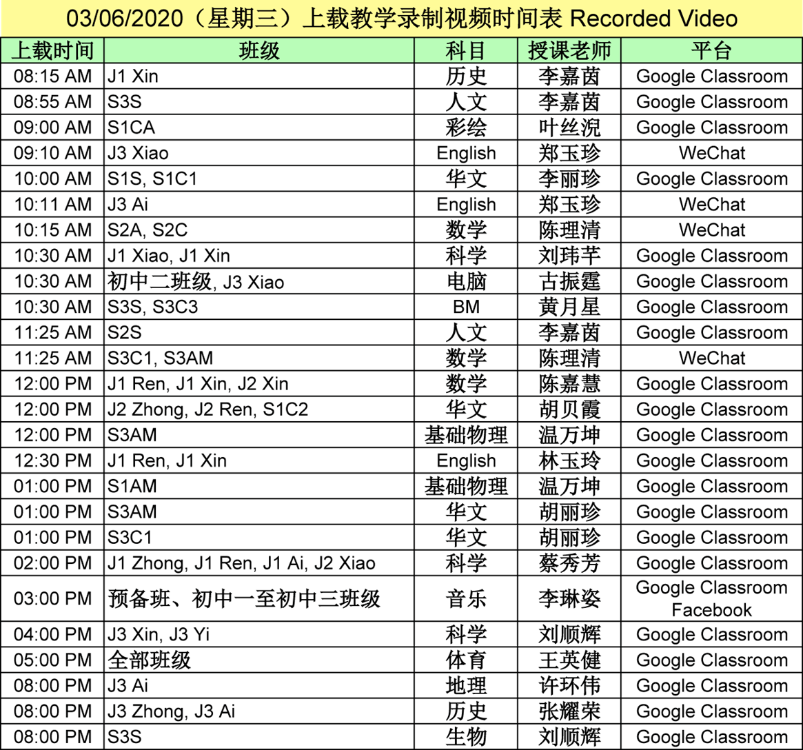 【01.06.2020~07.06.2020】“线上直播教学” 和 “上载教学录制视频” 时间表