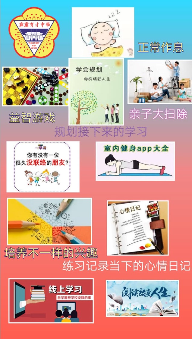 在第二阶段的行动管制令 (MCO) 期间,大家是否焦虑除了吃喝玩乐,还能做些什么活动,以避免浪费掉宝贵的时间呢? 辅导处在此建议同学们应珍惜时间,学习自律,安排自己的生活及学习,在行管令期间,不荒废时光。 附上图中的活动建议供大家参考,或许你有更好的建议,欢迎到脸书留言交流互动哦。 https://www.facebook.com/YuCaiDuZhong/posts/3350186344995535