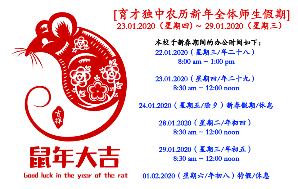 【育才独中农历新年全体师生假期】 23.01.2020(星期四)~ 29.01.2020(星期三) 30.01.2020(星期四)全体师生回校上课 本校于新春期间的办公时间如下: