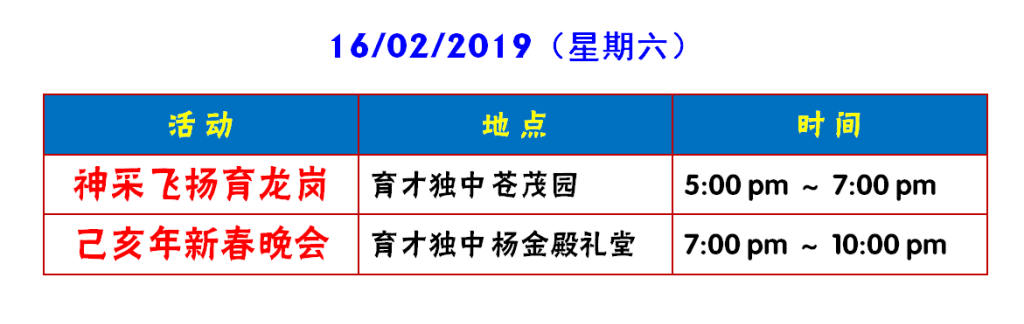 育才独中各区联委会热烈响应216新春团拜 2019年2月8日发布 本校己亥年新春团拜反应热烈,育才独中各区联络委员会热烈响应本校于2月16日(正月十二)星期六下午5时在校园举办的新春联谊活动和晚上7时的联欢晚宴。 新春晚会工委会总务吴景光披露,本校己亥年新春晚会反应热烈,目前已经超过100席,参与者还在增加,他吁请有关方面尽早通知本校董事会秘书处,以安排席位。 他说,团拜在当天下午5时开始,首先在本校苍茂园进行“神采飞扬育龙岗”交谊会,安排春节的活动,籍此让董事、校友、家长、老朋友以及各界人士,相互贺年、祝福问好和参观校园。接着晚上7时在本校杨金殿礼堂举行2019己亥年新春晚会,观赏精彩的文娱节目,届时来自各社团、各校代表,国州议员、国内外校友、各界人士友好欢聚一堂,共同欢庆新春佳节。 吴景光吁请出席者,在团拜当天穿上新春佳节的衣着,让热闹的场面,充满红彤彤、喜洋洋的新春气息。 详情请联络本校董事会秘书处(05 – 527 9522)或吴景光(016 – 558 1942)。