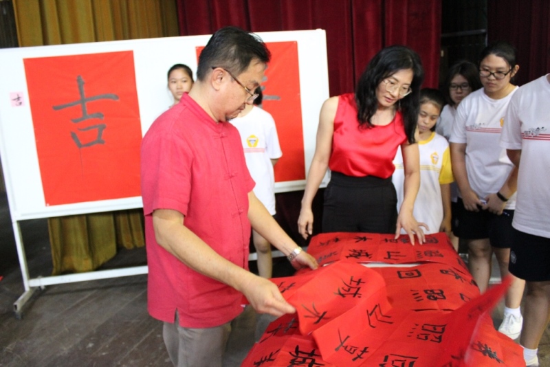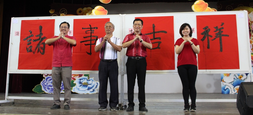 2019 己亥年校内挥春比赛 2019年2月2日发布 本校于2019年1月31日(星期四)举行“2019己亥年校内挥春比赛”,全校师生聚集在杨金殿礼堂写春联,迎接己亥猪年的到来。 这项活动是本校的年度活动之一,也是进行了多年的传统活动。挥春比赛共分为三个组别,分别是高中的甲组、初中二和初中三的乙组及预备班和初中一的丙组。甲组的春联写的是“图治励精兴国计,自强奋发育才心”,而乙组和丙组的春联则写“日照山城美,春回草木芳”。 出席这项活动的嘉宾包括本校董事长黄亚珠、署理董事长拿督吴国芳、评审温松钦和李勉娣,以及本校的校友。 温松钦(左起)、黄亚珠董事长、苏民胜校长和校友杨凯仪在比赛开始前 分别写出“诸”、“事”、“吉”、“祥”四字,并向各界拜个早年。 . 温松钦(左一)和李勉娣(左二)评审学生的作品。 . “2019己亥年校内挥春比赛”成绩: 【甲组(高中)】 冠军:黄玮恩(高一商) 亚军:李倩儿(高三商1) 季军:刘懿萱(高二理) . 【乙组(初中二、初中三)】 冠军:鍾愷颐(初二孝) 亚军:许佳惠(初二孝) 季军:钟科甯(初三信) . 【丙组(预备班、初中一)】 冠军:陈羽菲(初一忠) 亚军:李慧儿(初一孝) 季军:郑晴文(初一忠) 育才独中办迎春贺年活动 吁校友回校共庆佳节