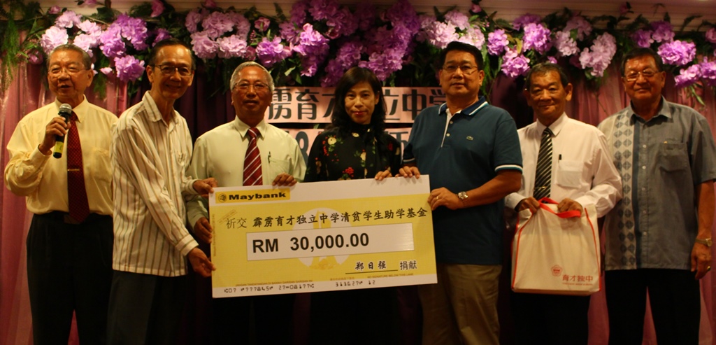 2018年教师节晚宴 2018年5月5日发布 本校董事会于2018年4月28日(星期六)举行教师节晚宴。当晚热心人士郑日强捐献育才独中清寒学生助学基金3万令吉,本校全体董事合力赠出1万3500令吉给全体教职员,每名教职员可获得100令吉作为鼓励。 此外,晚宴上也进行长期服务奖颁发仪式,奖励服务10年或以上的教职员。 郑日强夫妇(右三及右四)捐献育才独中清寒学生助学基金3万令吉,由本校董事会财政黄伟生(左二)代表接领。左一是董事会总务王瑞国,右起是署理董事长拿督吴国芳、教师节晚宴工委会主席兼副董事长覃介邦;左三是董事长黄亚珠。 本校董事长黄亚珠(左三)代表赠送纪念品予郑日强夫妇。 . 全体董事合力赠出1万3500令吉给全体教职员,由董事长黄亚珠(前排左三)移交给谢志明副校长(右四)代表接领。前排左起是董事蔡伟正、董事会总务王瑞国,左四是董事冯秀珠;右起是副董事长黄俊来、教职员联谊会主席王淑媚老师、陈美云副校长。后排左起是张福兴、董事会财政黄伟生、董事拿督黄文辉、副董事长覃介邦、董事拿督高利发、署理董事长拿督吴国芳、郑日强、副董事长拿督斯理罗智柔、副董事长黄美强。 . 获得长期服务奖的教职员与董事合照。 蔡亚汉主讲华教讲座