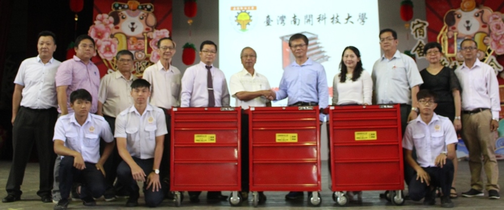 贺汽修厂落成之喜 南开科技大学赠汽修工具箱予本校 2018年4月26日发布 台湾南开科技大学于日前赠送6组汽修工具箱予本校,以祝贺本校110周年校庆及筹募新汽修厂基金与落成之喜。 有关工具箱由台湾南开科技大学国际交流暨两岸事务中心主任文淑盈及机械系主任赖柔雨助理教授代表赠送,并由本校董事长黄亚珠、董事会财政黄伟生、苏民胜校长和汽修科主任李国君等人代表接领。出席移交仪式的还包括了本校谢志明副校长、辅导主任陈美云副校长、汽修科教师幸齐能、钟国华和卢赋钊。 赖柔雨和文淑盈(右五和右四)代表南开科技大学赠送汽修工具箱予本校,由董事长黄亚珠(左六)、苏民胜校长(左五)、董事会财政黄伟生(左四)和汽修科主任李国君(右一)接领。右二起本校陈美云副校长、谢志明副校长,左一起汽修科教师幸齐能、钟国华和卢赋钊。 本校汽修科主任李国君对于南开科技大学的慷慨捐献表示感谢。他说,这6组工具箱将给予汽修科学生在实习方面提供援助,也为新落成的汽修厂省却了一笔添购工具箱的经费。 他指出,本校在2013年开始成为南开科技大学的海外策略联盟学校,至今为止本校已保送数十名毕业生到该大学深造,这是两校之间的紧密联系所带来的正面成果。 文淑盈也表示,育才独中作为南开科技大学的海外策略联盟学校,该大学提供直接报名申请的便利和学杂费半免的优惠,让育才独中毕业生能够在无后顾之忧的情况下在大学深造。