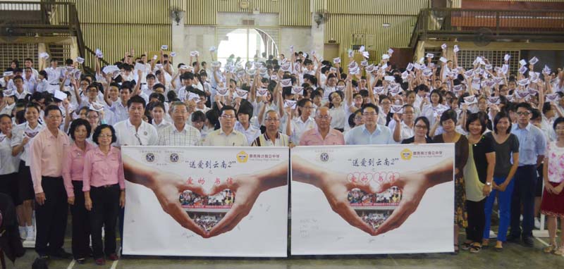 本校响应“送爱到云南” 向灾区儿童献寄语 怡保国际同济会于11月19日(星期三)在本校展开“送爱到云南2”之“爱的书信”计划,通过书信方式,让本校540名学生每人在特制的明信片上写上寄语,由校方移交给怡保国际同济会,再转交给中国云南省鲁甸县地震灾区的儿童,传递爱心,表达关怀与鼓励。 云南省鲁甸县于今年8月3日发生6.5级地震,造成震央龙头镇90%的房屋倒塌或变成危楼,临近地区也受影响,学校成危楼,学生被安置在临时搭建的抗震校舍上课。 这项计划由怡保国际同济会和宏艺市国际同济会联办,本校初中和高中的学生除了透过书信向灾区儿童传递爱心,也在布条上签名,收集到1千个签名的“送爱”海报,将交到灾区儿童手中。 学生举起明信片,和主办单位及师长合照,“送爱”海报收集到1千个签名,将转交灾区儿童; 左起为工委会财政岑焯兴、委员蔡爱玉、龙凤珍和秘书朱锦球、本校董事会教育主任王瑞国、校长苏民胜、 董事长黄亚珠,以及工委会主席黄美强和怡保国际同济会会长孔祥兴。 本校初一仁班和高二商班参观霹雳州反贪污委员会总部
