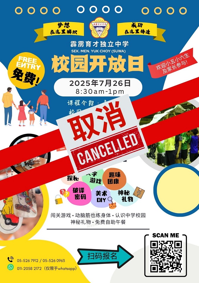 校内口试评估(二) 2025年7月22日发布 继上个月(6月)顺利完成初三及高三学生的口试评估后,7月轮到初二与高二学生进行英语与国语的口试测验。接下来,校方也将陆续安排初一与高一学生参与口试评估,以期全面提升学生在语文表达能力与口语沟通技巧方面的综合水平。 此项评估不仅是阶段性学习成果的检验,更是激发语言学习兴趣、增强实用沟通能力的重要环节。 中国大学宣讲会