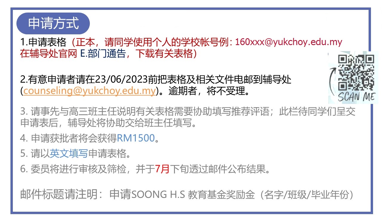 “SOONG H.S教育基金奖励金” 开放申请 2023年5月7日发布 由热心人士SOONG H.S所成立的“SOONG H.S教育基金奖励金”目前已开放申请。 有意要申请的校友可以到本校辅导处的网页 https://sites.google.com/yukchoy.edu.my/counselling/ 查询和申请。 |