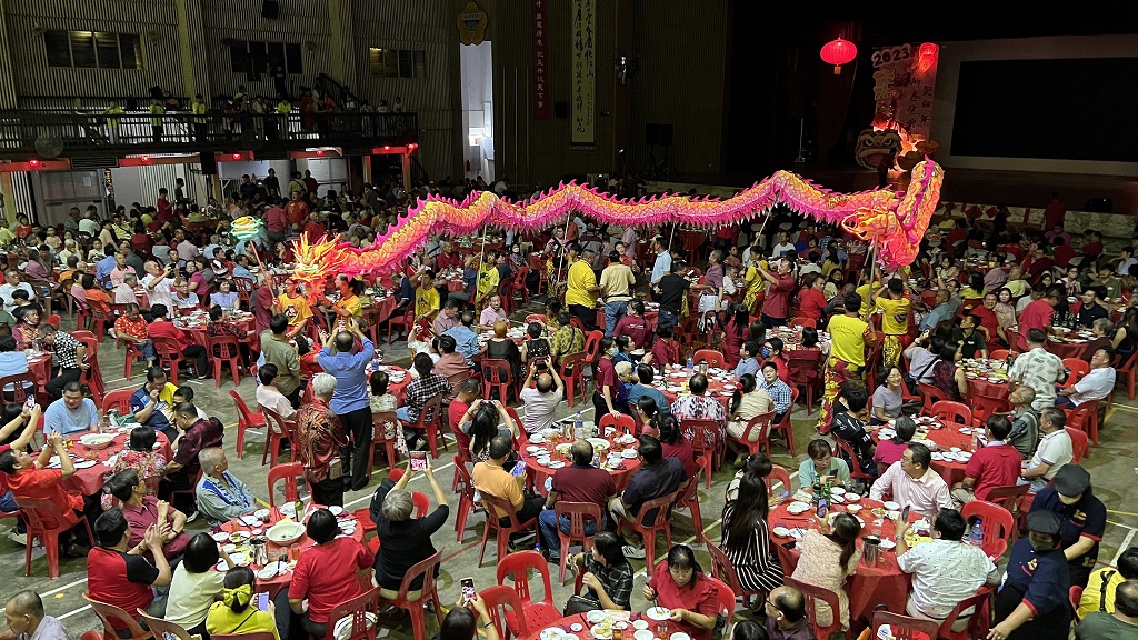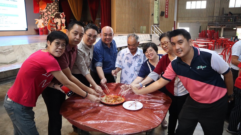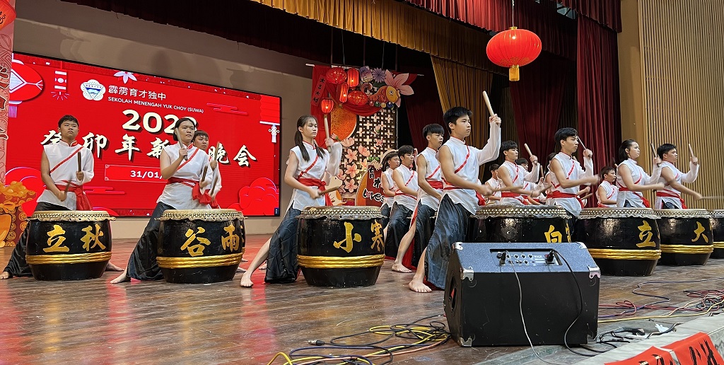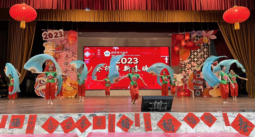 本校癸卯年新春团拜晚会于年初十(1月31日)晚上七时,在杨金殿礼堂举行并筵开100席,千人聚会反应热烈。 当晚,来宾们身穿红彤彤的民族服装出席新春团拜晚会,校园内洋溢春节气息。大家除了享用佳肴集体捞生之外,也欣赏瑞狮呈祥、华乐、歌唱、舞蹈、武术、LED 舞龙以及二十四节令鼓表演等。 大会也特邀首相政治秘书曾敏凯、九洞州议员谢保恒、大会主席郑美云董事长、工委会主席拿督黄美强、署理董事长黄亚珠上台挥毫,恭祝各界玉兔迎春,兔年行大运! 出席嘉宾尚有本校医药顾问李文材医生、法律顾问丹斯里拿督郑可扬、张国耀律师、霹雳中华大会堂署理堂长张送定、霹雳中华总商会总会长拿督廖志明、霹雳董联会总务黄志伟及副财政叶建成、新纪元大学学院代表(朱文彬、蔡凤鸣)、霹雳育才校友会理事长陈金灼、年轻企业家Bryan Tan及夫人、各位副董事长、董事、校长、副校长、各所小学正副校长等。 大会主席郑美云董事长致词表示,由于疫情的关系,本校已有两年没有举办新春团拜晚会,希望新的一年,这个疫情可以尽快消失,大家不用再战战兢兢地过日子,继续保持身体健康,阖家平安。 她恭祝来宾们新年快乐,尽情享受这个热闹欢乐的气氛,籍此相聚一堂,共度新春。同时,感谢各界社会人士长久以来对育才独中的支持与认可,希望大家未来也能继续热心华教、支持育才! 工委会主席黄美强副董事长在会上向全体出席者敬酒,一、庆祝抗疫胜利;二、祝贺我国第10任首相上任,支持他以民为本的治国理念,实现尊严廉洁,多元公正,繁荣昌盛的马来西亚;三、献给全国独中,随着中国成为世界第二大经济体,读讲华语已经全球化,越来越多国家接受华文教育,因此独中已经协助我国在国际社会竞争中占了优势。