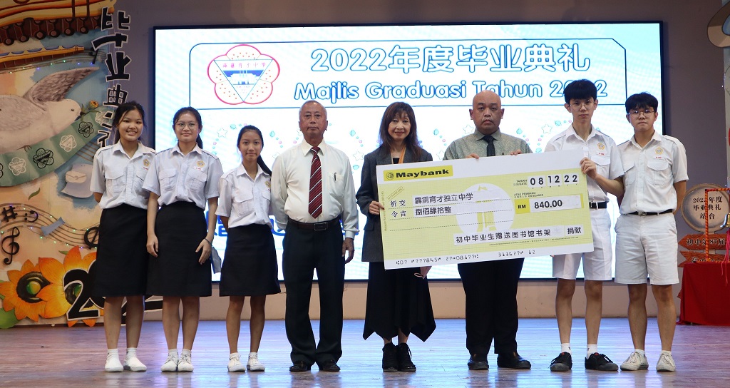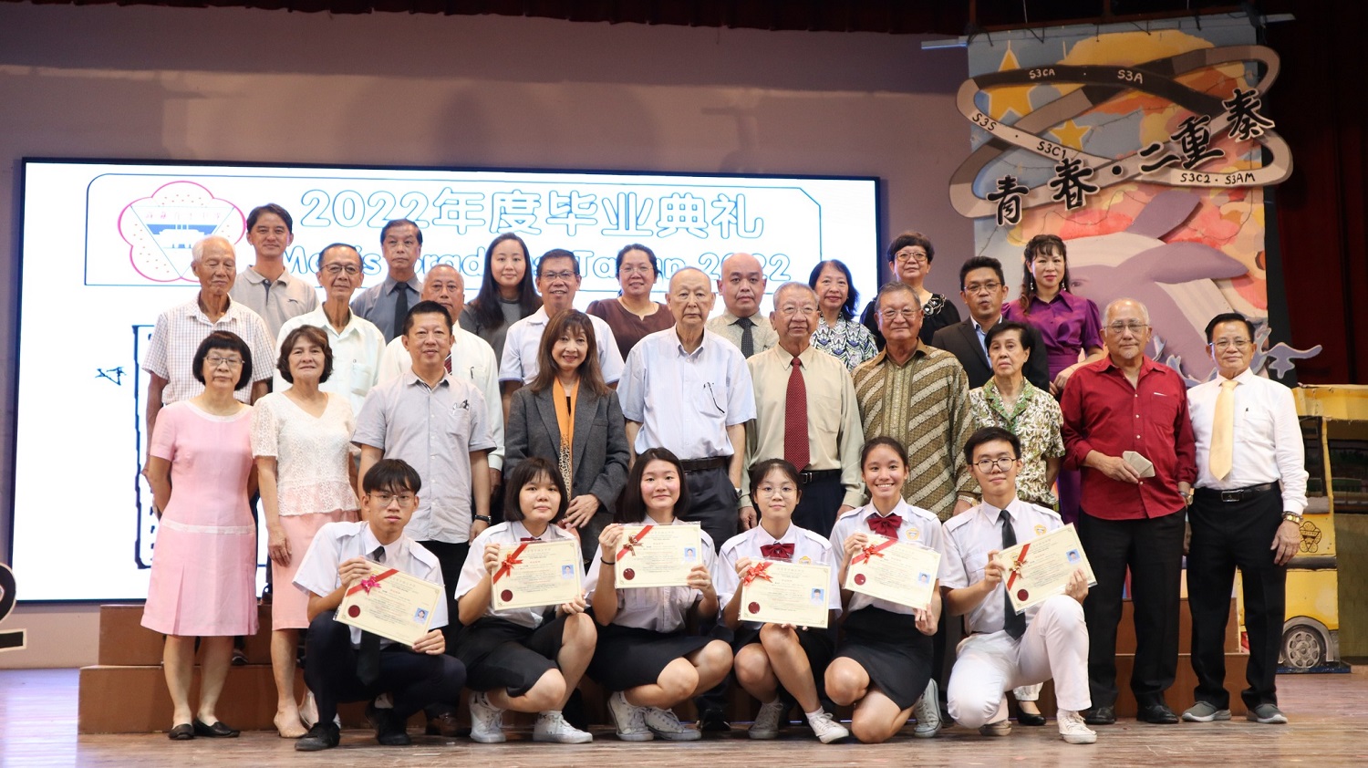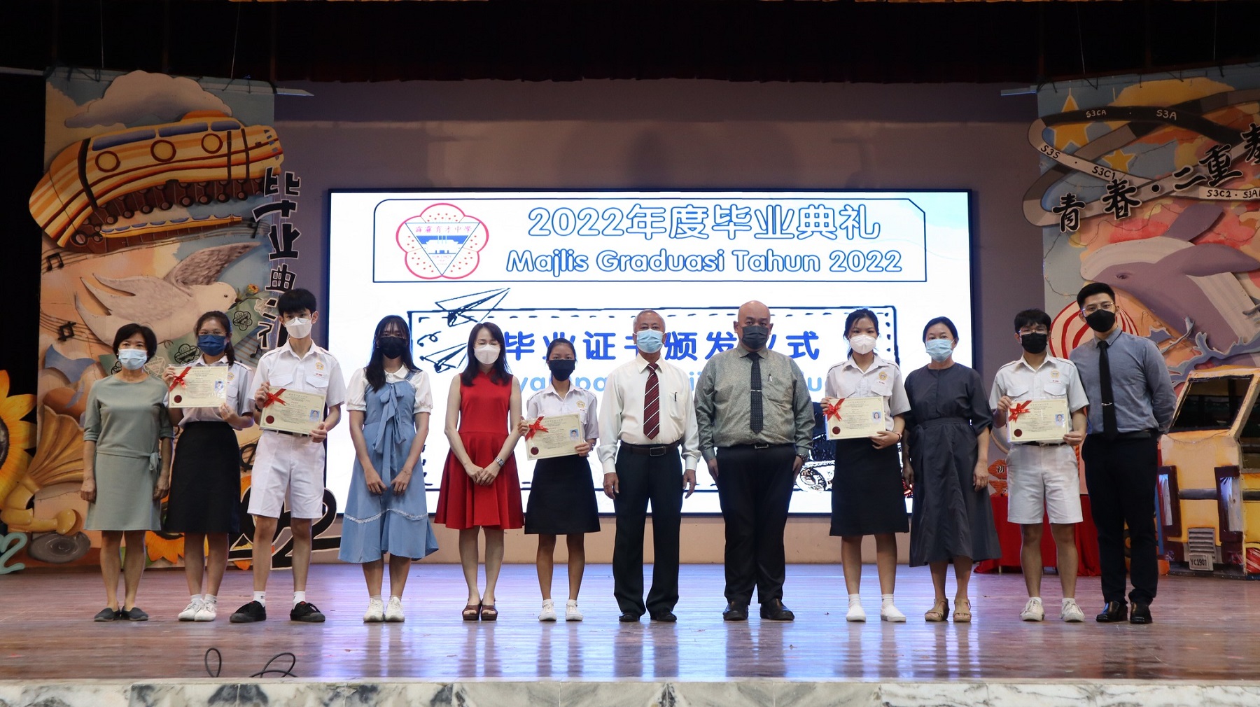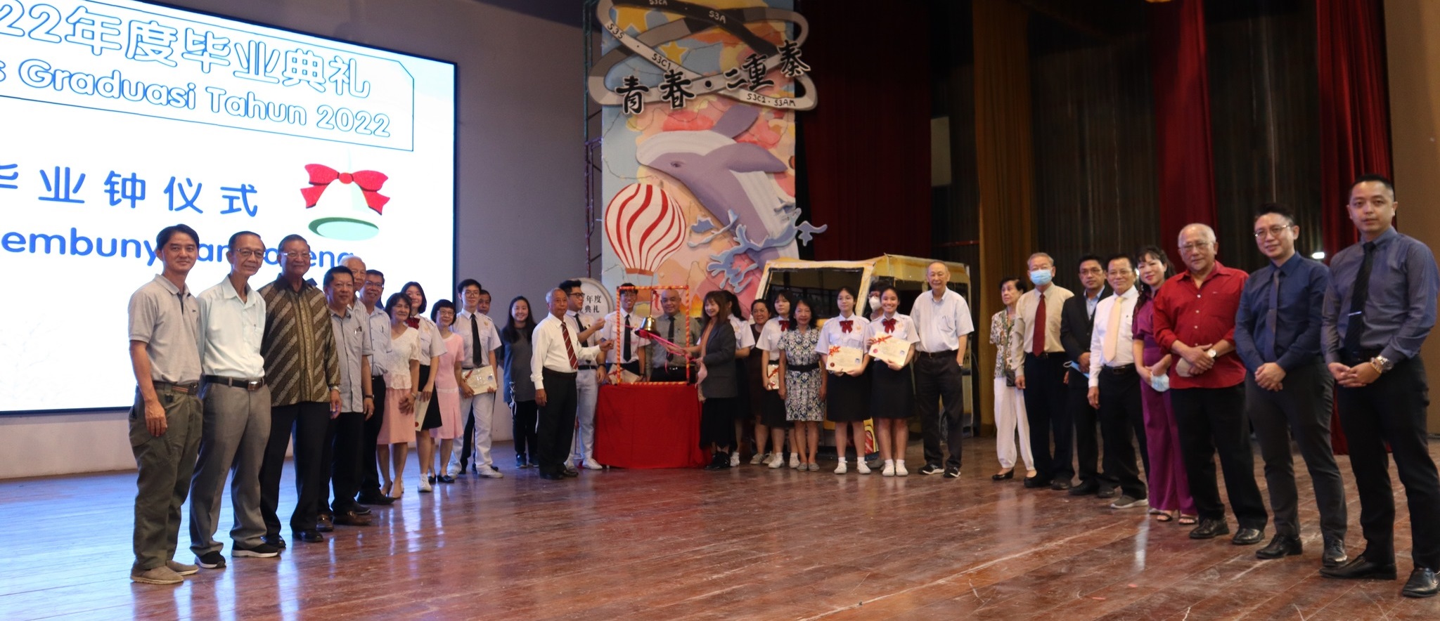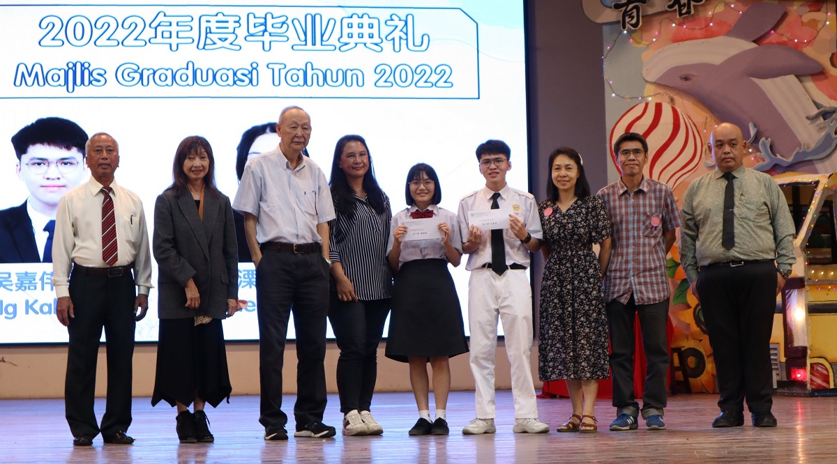 2022年结业暨颁奖典礼 2022年12月13日发布 本校于学校假期前最后一天(12月9日)举行结业暨颁奖典礼,表扬及肯定学生在2022年的优良表现。 当天首先进行的是万能颁奖仪式,万能企业通过企业社会责任部门颁发年度“万能学术励志奖”给本校师生,即“学术卓越奖”、“最佳学术跃进奖”和“最敬业爱心教师奖”。 在这些奖项当中,“学术卓越奖”共有34名得奖者、“最佳学术跃进奖”有7名得奖者,而“最敬业爱心教师奖”则由邹国强老师获得。所有奖项皆由万能企业霹雳州副经理姚荣尹颁发。 万能企业通过“万能学术励志奖”奖励优秀师生,旨在肯定学术卓越和勤奋好学的学生,同时表彰教师的敬业精神和对学生的无私教导。每位得奖学生可获得奖状和奖励金,敬业爱心教师也同样获得奖状和奖励金。此外,万能爱心今年也赠送一棵特制的“盆景树”给教师,以代表认可教师培养学生的用心。历年来,已有无数学生受惠于“万能学术励志奖”,万能企业希望学生毕业后能够成为负责任和有爱心的社会人士,以正能量服务及回馈社会。 除了颁发万能的奖项外,本校也颁发多个校内外比赛奖项,包括陈景润杯中学数学比赛、澳洲数学比赛、2021年SPM成绩优秀奖、各班前三名成绩优秀奖、各科成绩优异奖、学业成绩优异奖、品行优良奖、高中学长服务证书、国语论坛比赛、校内国文作文比赛、英文作文比赛、全球侨校学生暨侨生歌唱比赛、育才创校115周年校庆摄影比赛、校内书法比赛、图书馆阅书量比赛、班级卫生比赛、北近打县16岁篮球赛、校内班级三人篮球赛、全霹雳学联篮球赛、霹雳董联会70周年华教义跑。 黎镇光校长恭贺所有得奖者,希望他们在来年更上一层楼。他也勉励其他未能在今年获奖的同学以他们为榜样,在新的学年再接再厉争取优良表现,以不辜负师长的期望。 万能企业霹雳州经理姚荣尹(前排左三)代表该公司颁发“万能学术励志奖”给本校学生。 前排右起为教务主任胡丽珍老师、黎镇光校长;左起朱荣熙副校长、刘国荣副校长。 . 万能企业霹雳州副经理姚荣尹(左二)代表该公司颁发“最敬业爱心教师奖”给邹国强老师(右三)。 右起为教务主任胡丽珍老师、朱荣熙副校长;左三为黎镇光校长;左一为刘国荣副校长。 . 【颁发各班前三名成绩优秀奖】前排右起教务主任胡丽珍老师、黎镇光校长、朱荣熙副校长、刘国荣副校长。 . 【颁发品行优良奖】前排右起朱荣熙副校长、刘国荣副校长、训育主任王淑媚老师。 2022年 “青春 · 二重奏”毕业典礼