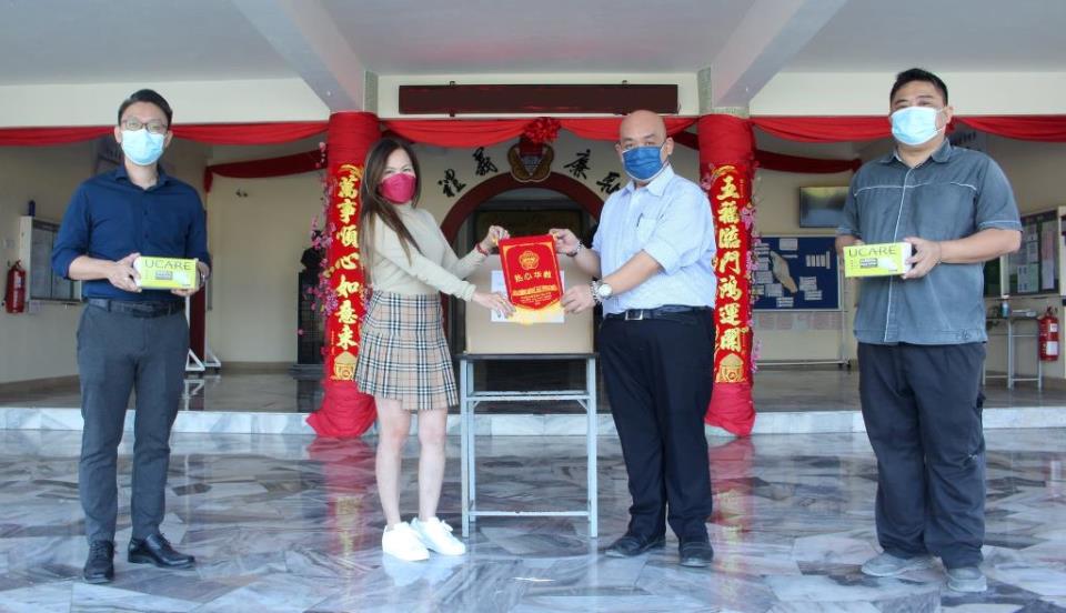 SHINEUP VENTURE SDN BHD 董事朱珍爱女士移交口罩予本校, 由黎镇光校长代表接领并且颁发感谢状及锦旗以示感谢, 刘国荣副校长(左一)、事务处主任锺国华老师(右一)陪同。 感谢善心人士捐赠新春爱心礼盒予本校清寒学子