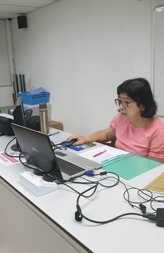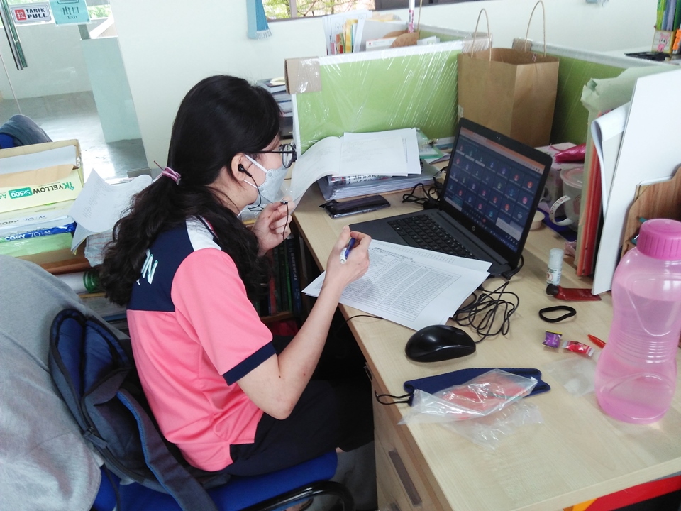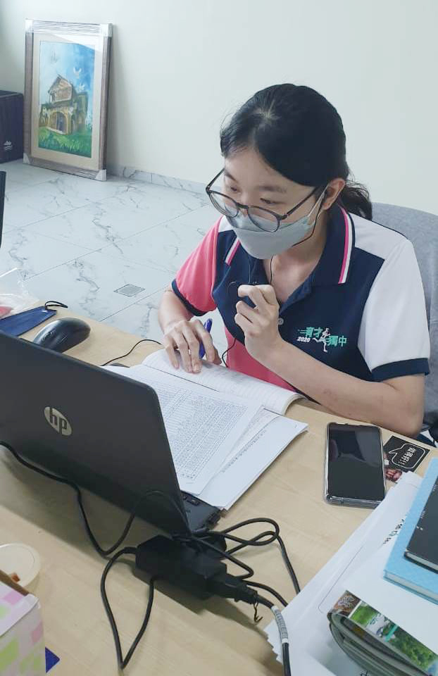 左起本校宣教处助理李嘉茵、阮雪琴女士和丈夫李伍双先生, 右一为本校事务处主任锺国华老师。 新生与班主任线上见面会