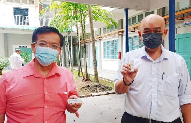 本校高三学生今日复课,为了确保校园的防疫安全,让家长放心,校方除了严格遵守学校复课标准作业程序,也于今早派发冠病快筛试剂盒予教职员自行检测,降低校园的冠病入侵风险。 黎镇光校长和行政老师们今日一早便守在指定的校园入口处,引导学生测量体温、整理仪容后再进入校园。本校复课前已做好准备工作,整顿校园,进行消毒工作,以保持卫生整洁。