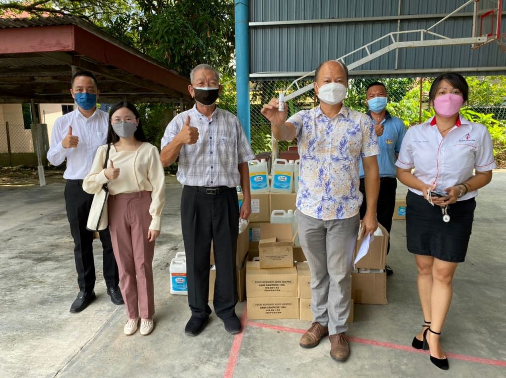 本校感谢九洞区州议员谢保恒(前排右二)捐助一批消毒物品予本校,由本校副校长朱荣熙(前排左起)、董事会执行秘书余依程、董事副总务王瑞国博士和事务副主任周启良(后排右)接领,前排右一为州议员助理林美缃。 感谢 QR OYES 有限公司创办人林藻钿捐赠4台消毒喷雾机