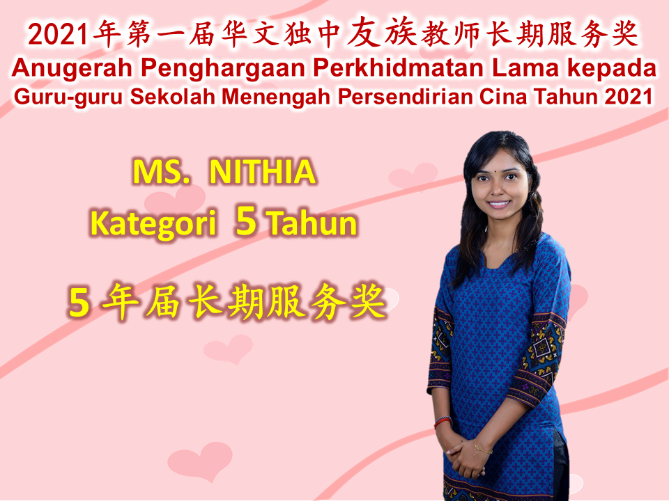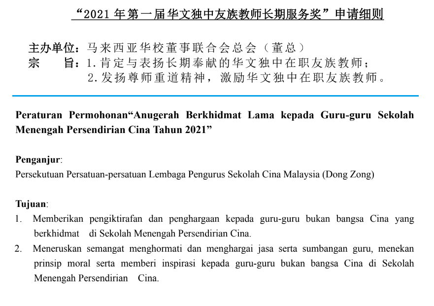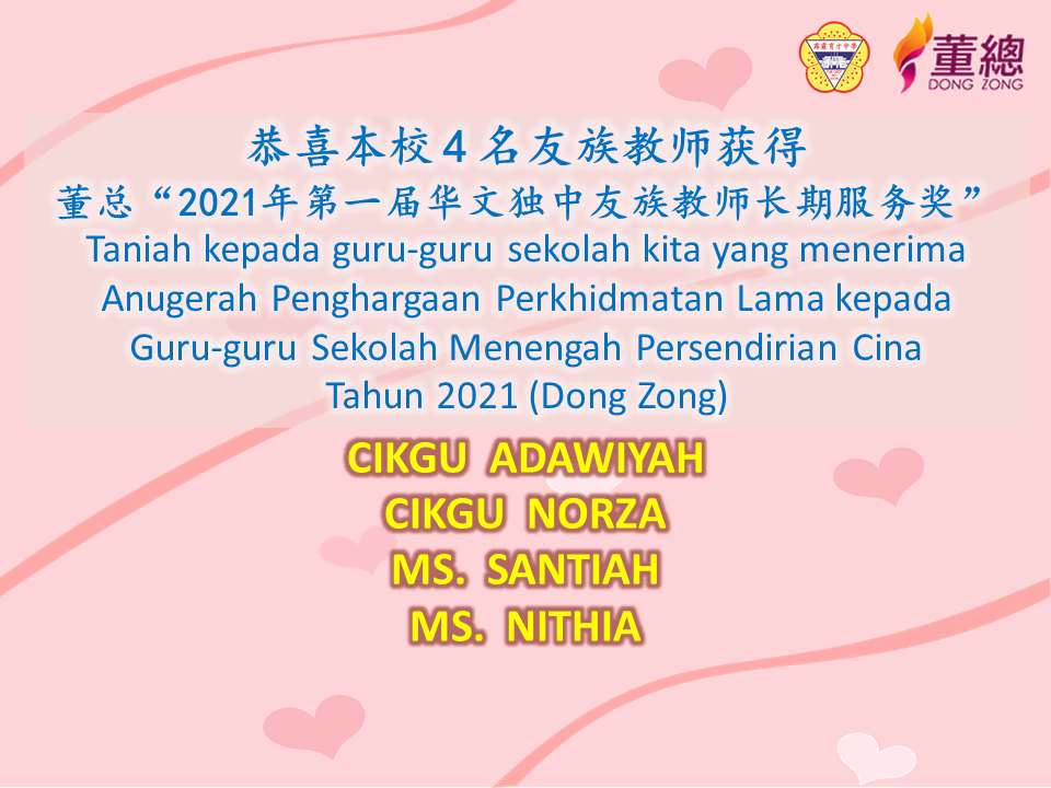 恭喜本校4名友族教师获得董总“2021年第一届华文独中友族教师长期服务奖”。 Congratulations to our four teachers who have received the Long Service Award 2021 from Dong Zong.