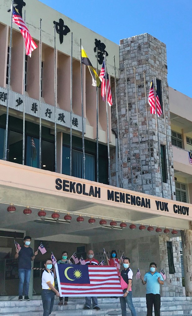 黎镇光校长(后排左三)率领副校长和行政主任挥舞国旗,欢庆国庆日。后排左起为辅导主任许环伟、宣教主任吴鄢如、教务主任胡丽珍,前排左起为刘国荣副校长、朱荣熙副校长、事务主任锺国华。 . 配合“831国庆日”,还有“916马来西亚日”的到来,育才独中在校园内挂满了国旗,向国人传达爱国意识,以及为马来西亚64周年国庆日助兴! 黎镇光校长说,育才独中主要是以母语教育为主,在传颂和发扬中华文化的过程当中,也注重提高学生在国语与英语的水平,并且时刻灌输学生对我国历史、族群、语言和文化方面的知识,培养学生对国家身份的认同,也为巩固国家团结、族群融合出一份力。 他说,教育事业旨在为国家及社会培养栋樑之材。育才独中是一所民办学校,在创校逾100年的过程中,获得各界热心教育人士的帮助,培养出一批又一批兼具德、智、体、群、美的国家栋樑,如今遍布全国各地,乃至国外,为国家及社会献出一份力。 “我希望通过国庆日和马来西亚日的活动,除了让学生培养爱国情操外,也让学生学习先贤们在争取独立的过程中展现的不屈不挠精神。” 育才独中校园的各个角落都可以看到辉煌条纹在飘扬,教学大楼、校门旁侧长长的围篱、车道旁的路灯亦张挂了国旗、13州州旗及联邦直辖区区旗,整个校园充满了欢庆国庆日的气氛。 |