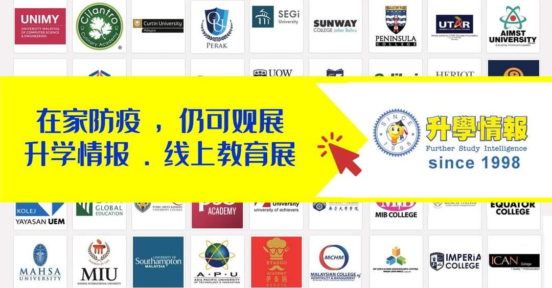 打破疫情的限!由本校和升学情报中心联合主办的2021年度“为您导航”升学辅导与教育资讯日将于9月18日(星期六)上午9时至下午1时,在Zoom线上视讯平台举行。 这项活动将让本校全体高中二和高中三的学生和国内、外大专院校,在安全的情况下面对面接触,为学生提供第一手的升学资讯与辅导,以协助他们规划升学的途径。 参与这项活动的教育单位多达42个,他们所提供的课程包括电脑、商科、财经、工程、法律、语文、美术设计、大众传播、酒店管理、医药卫生、生命科学、社会科学等等科系;此外,另有各国留学服务机构提供咨询服务,包括中国、台湾、英国、美国、澳洲、纽西兰、爱尔兰等等。 本校辅导处主任许环伟老师表示,辅导处已经与升学情报中心合作多年,为本校高中学生举办升学站与辅导工作,此次也不例外。 许老师说,此次的升学辅导采取预约制,主办单位已向申请预约参访单位的同学发出预约参访链接,因此请同学们不要错过难得的机会,一定要赴约。 “为您导航”升学辅导与教育资讯日自2001年创办至今,20年来已经在逾百所中学举办了近千场活动。而今年的活动首度采用线上模式取代实体活动,以突破疫情下的实体社交限制,让学生不因疫情而失去应有的升学辅导和生涯教育。 若有任何询问,欢迎联络本校辅导处许环伟老师或升学情报中心刘国伟先生012 – 367 3123。 参与展出的教育机构名单: 1. ACCA Malaysia 2. Asia Pacific University of Technology & Innovation 3. AUG Global Network 4. Cilantro Culinary Academy 5. Curtin University Malaysia Campus 6. Dasein Academy Of Art 7. Era Technology Communication Art & Design 8. Eynesbury College — UniSA (留学澳洲) 9. Education Network Center 留学中国中心 (留学中国) 10. Infrastructure University Kuala Lumpur (IUKL) 11. Inter Excel Tourism Academy 12. INTI International University 13. JM Education Group Sdn. Bhd 14. JMC Academy 15. KDU University College 16. Keris College 17. KTC Accountants Institute 18. LUpeichun Japan Education Centre 19. Malaysian Institute Of Art 20. Monash University Australia (留学澳洲) 21. New Era University College 22. Pro Edu 升学辅导(留学中国、英、澳、纽、加及本地大学、性格测试) 23. PSB Academy (Singapore) 24. Raffles University 25. Segi University & Colleges 26. Singapore Institute of Management Global Education 27. Sunway University 28. The One Academy Penang 29. Torrens University Australia (留学澳洲) 30. Tunku Abdul Rahman University College (拉曼大学学院) 31. UCSI UNIVERSITY 32. UNDO Academy 33. UNIVERSITI TUNKU ABDUL RAHMAN (UTAR) 34. University of Nottingham Malaysia 35. University of Southampton Malaysia 36. University of Southampton United Kingdom (留学英国) 37. Xiamen University Malaysia 38. 北京外国语大学 (留学中国) 39. 华侨大学(留学中国) 40. 马来西亚留华同学会(留学中国) 41. 明志科技大学 (留学台湾) 42. 马来西亚留台校友联合总会(留学台湾) 【2021年9月18日】脸书直播:招收2022学年新生线上第二次说明会(教务处、辅导处篇)10月30日办线上新生入学考试
