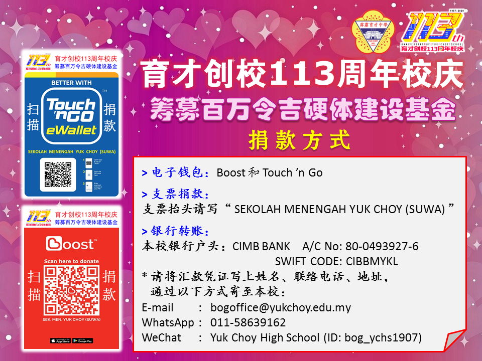“育才创校113周年校庆线上晚会” 捐款方式 育才独中将于2020年12月18日(星期五)晚上7时,在脸书直播庆祝育才创校113周年线上晚会,以筹募百万令吉充作硬体建设基金。 本校促请各界热心教育人士在疫情爆发这艰难时刻,爱护育才,鼎力支持育才的办学、建设与发展,踊跃捐款。