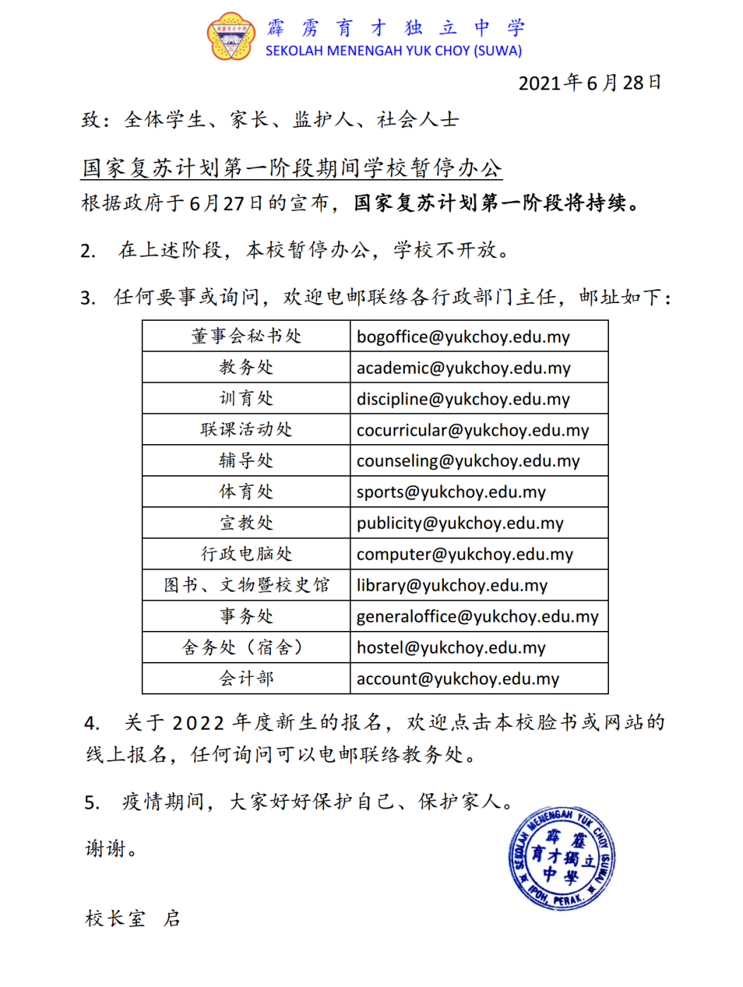 【通告】国家复苏计划第一阶段期间 学校暂停办公