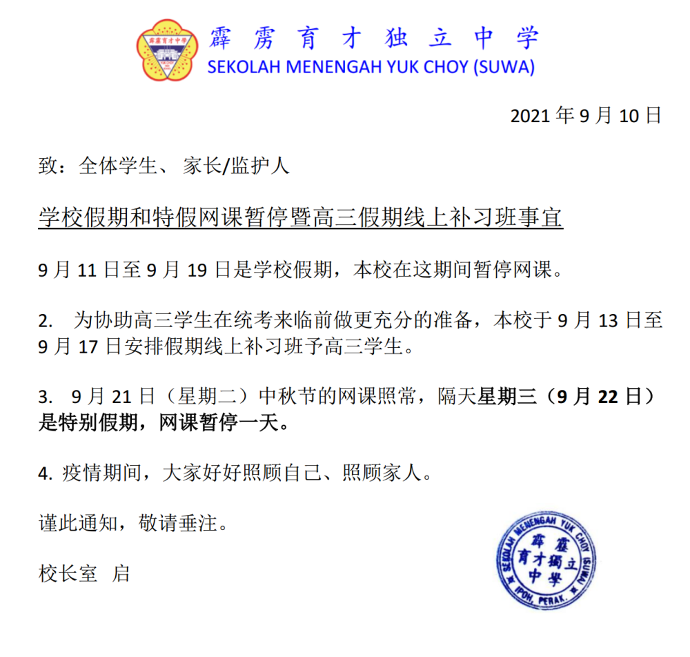 【通告】学校假期和特假网课暂停暨高三假期线上补习班事宜