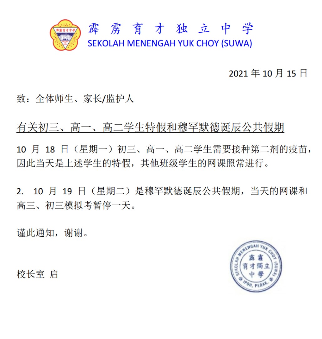 【通告】有关初三、高一、高二学生特假和穆罕默德诞辰公共假期