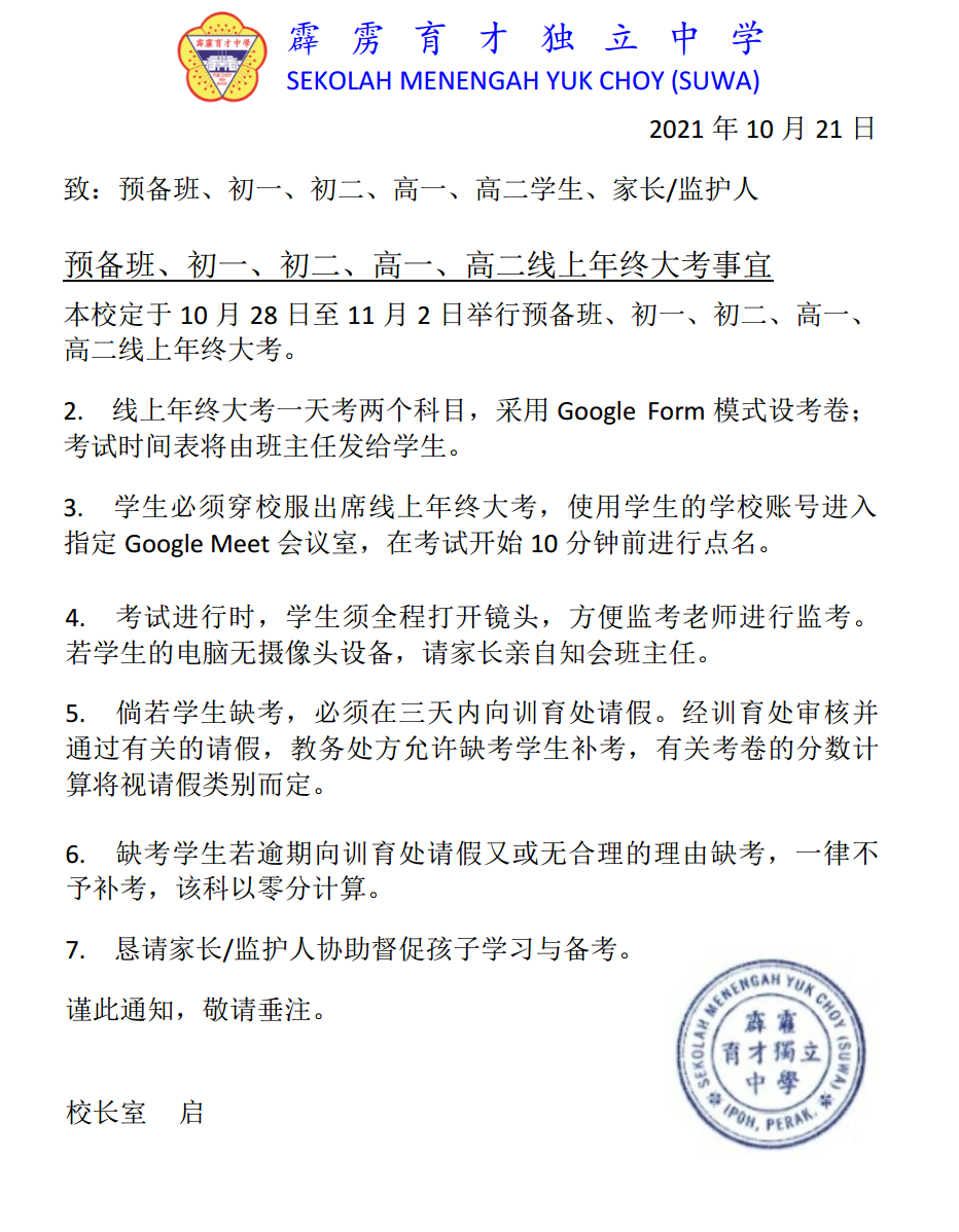 【通告】预备班、初一、初二、高一、高二线上年终大考