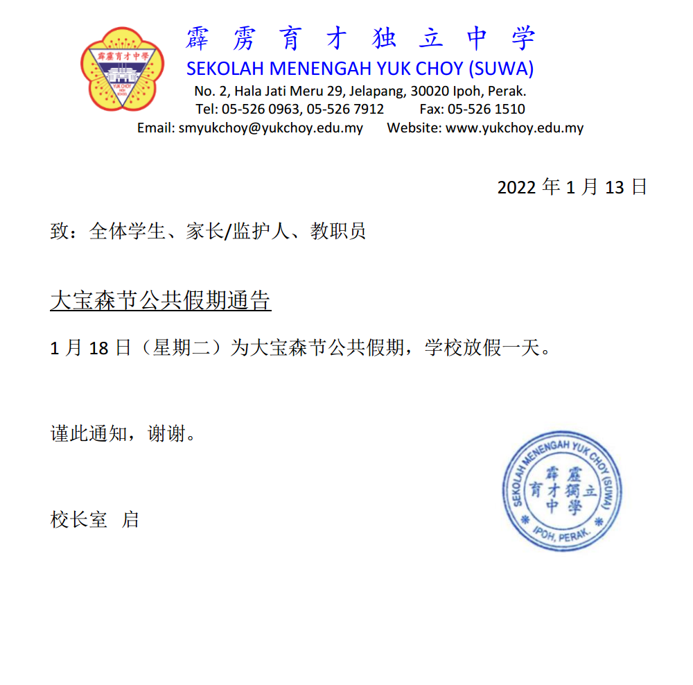 【通告】大宝森节公共假期