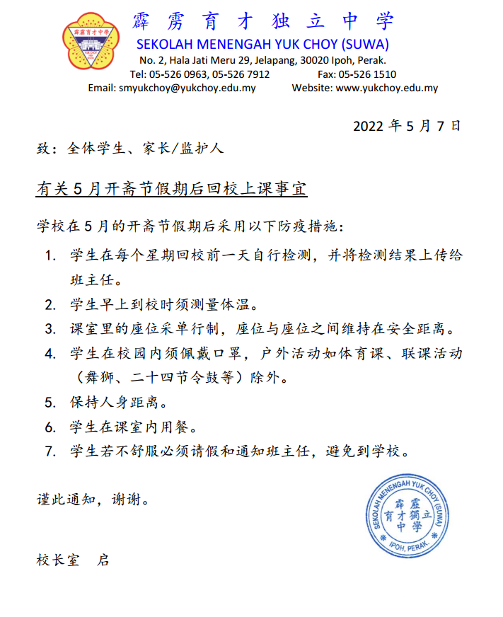 月开斋节假期后回校上课事宜