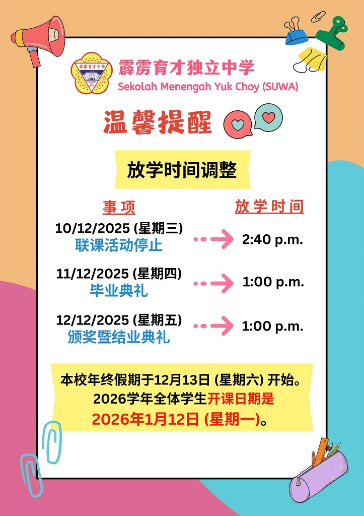 【通告】温馨提醒:有关调整放学时间、年终假期及