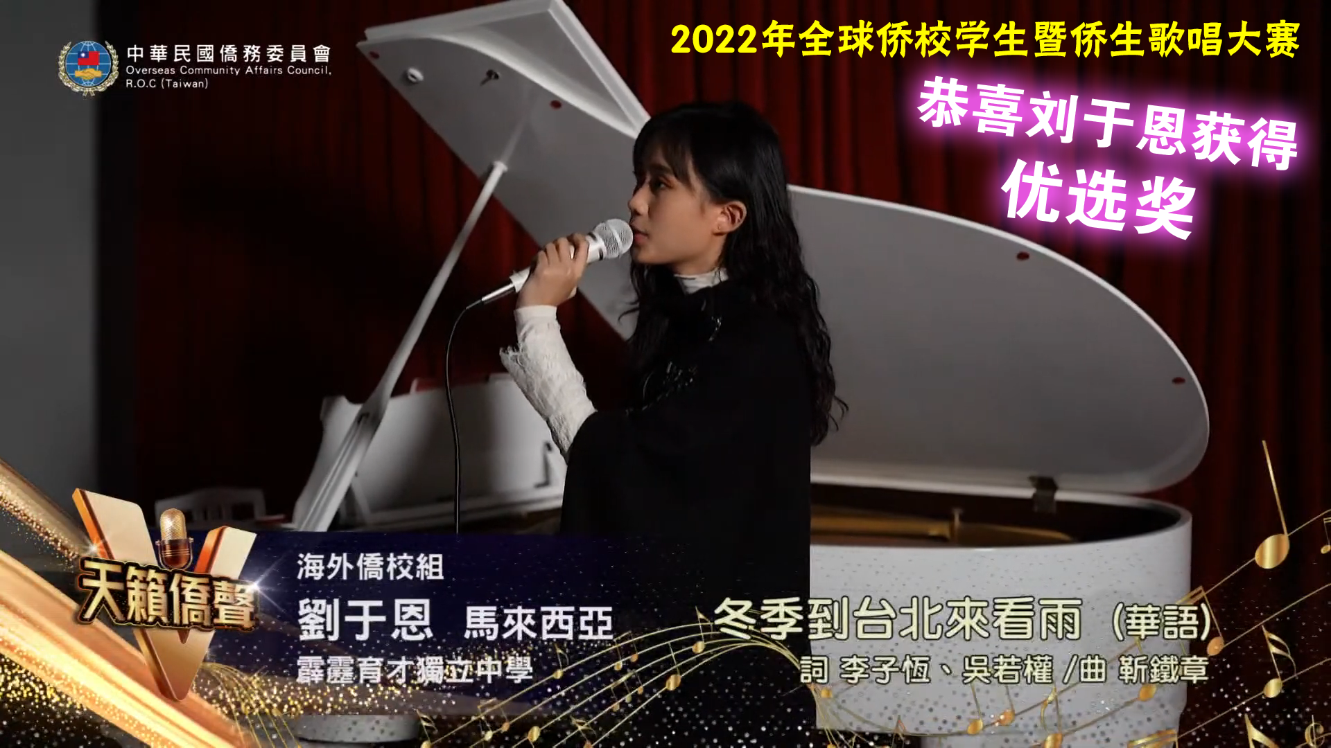 恭喜本校刘于恩同学,获得“2022年全球侨校学生暨侨生歌唱大赛(海外侨校学生组)”优选奖!