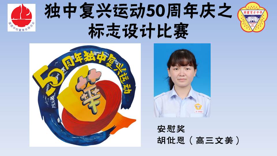本校三名文美班学生参加“独中复兴运动50周年标志设计比赛”表现优异,获得两个优秀奖和一个安慰奖。