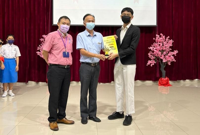 黎镇光校长(左一)于周会上表扬在华语诗歌朗诵比赛获奖的杨曲星,右一是负责老师胡丽珍。
