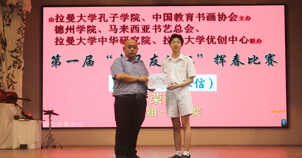- 第一届”中马友谊杯“挥春比赛(拉曼大学孔子学院、中国教育书画协会主办,德州学院、马来西亚书艺总会、拉曼大学中华研究院及拉曼大学优创中心联办):中学组 佳作奖