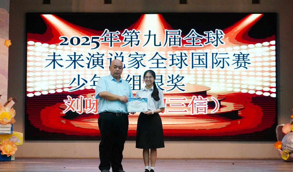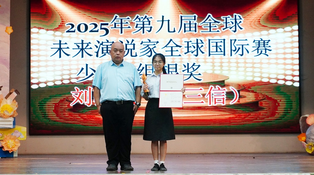 “2025年第九届全球未来演说家”大赛 小小演说家 · 耀眼国际 本校刘咏歆同学(初三信)参加“2025年第九届全球未来演说家”大赛,凭借出色的演说实力与稳健的舞台表现,先后在国内赛与国际赛中脱颖而出,斩获佳绩,充分展现育才学子的自信风采与语言魅力!
