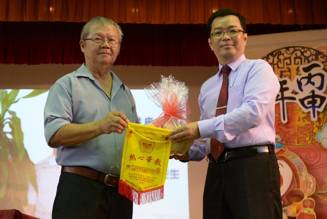 他说,没想自己会到在毕业58年以后,能以捐款人的身份站在舞台上,接受在场学生给予的热烈反应,非常感动。他勉励学生好好学习中华文化,学会多几种语文,提高在社会上的竞争能力。
