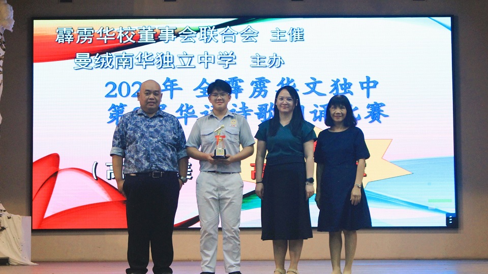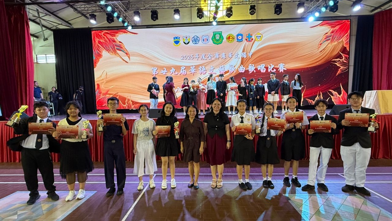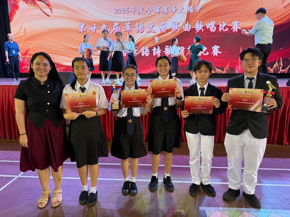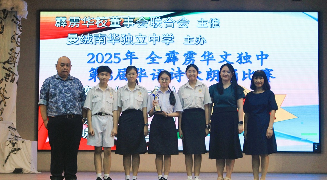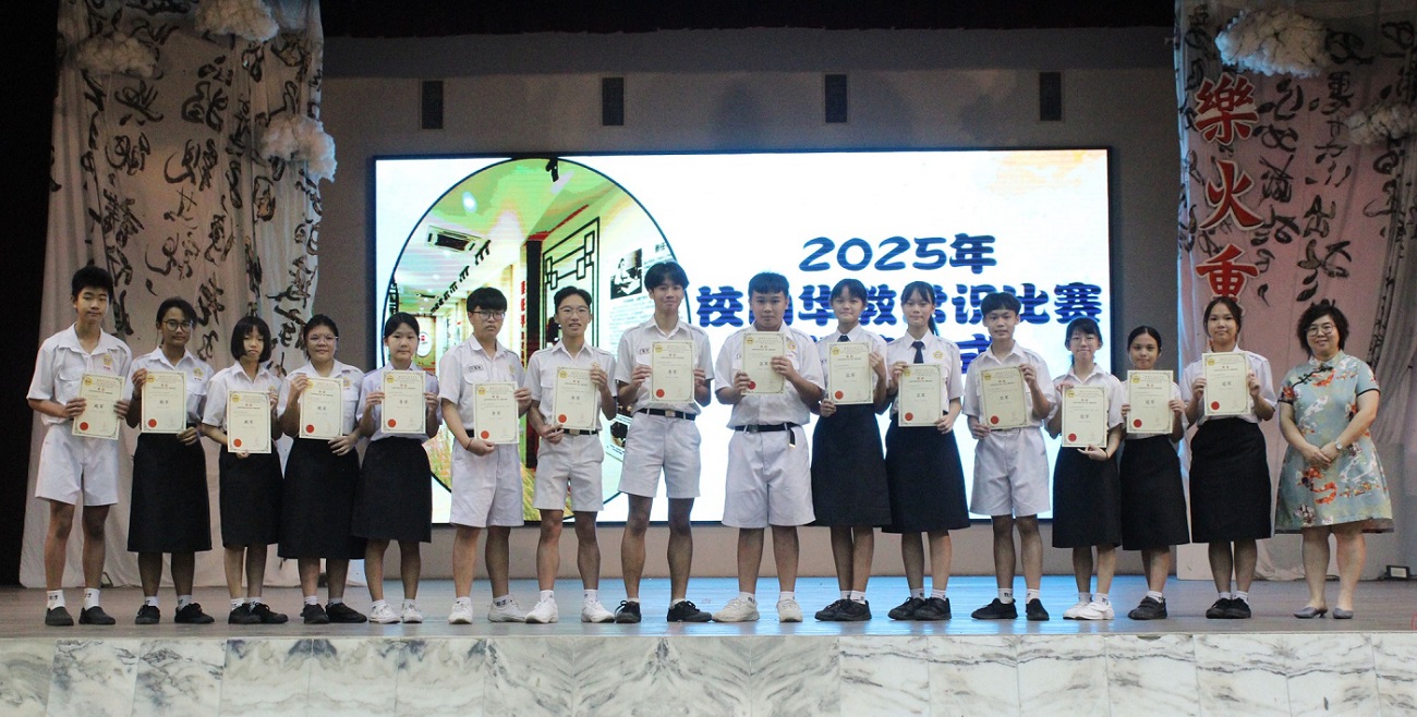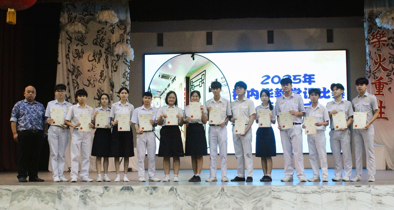 2025年全霹雳华文独中第29届华语文艺歌曲歌唱比赛 本校刘誌中老师、周素云老师和陈丽华老师今天带领10位同学前往曼绒南华独中参加“2025年全霹雳华文独中第29届华语文艺歌曲歌唱比赛暨第8届华语诗歌朗诵比赛”,本校参赛选手在这两项比赛中获得不俗的成绩。 “2025年全霹雳华文独中第8届华语诗歌朗诵比赛”成绩: 【初中组 冠军】:孔楚儿(初二孝)、谢咏心(初二爱)、刘咏歆(初三信)、王奕腾(初一信)朗诵《瑜伽术》 【高中组 季军】:陈家乐(高一文美)朗诵《父亲节》 诗歌朗诵教练:张奕霖语音老师 “2025年全霹雳华文独中第29届华语文艺歌曲歌唱比赛”成绩: 【初中男生组 冠军】:周伟则(初一仁)演唱歌曲《桑塔露琪亚》 【初中女生组 优胜奖】:周盈思(初一忠)演唱歌曲《康定情歌》 【高中男生组 亚军】:苏文康(高三汽修)演唱歌曲《星星索》 【高中女生组 优胜奖】:周颖芯(高一理)演唱歌曲《珊瑚颂》 钢琴伴奏:周颖芯(高一理)、王丽嘉(初三忠) 歌唱教练:李逸辉老师 . . 校方在周会上表扬得奖学生。 “Malaysia Asian Parliamentary 2025”英语辩论赛:中学组冠军、学生组最佳辩手第四名