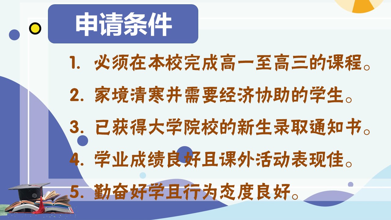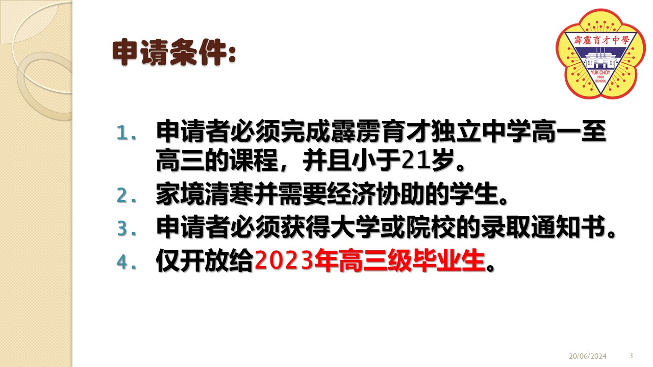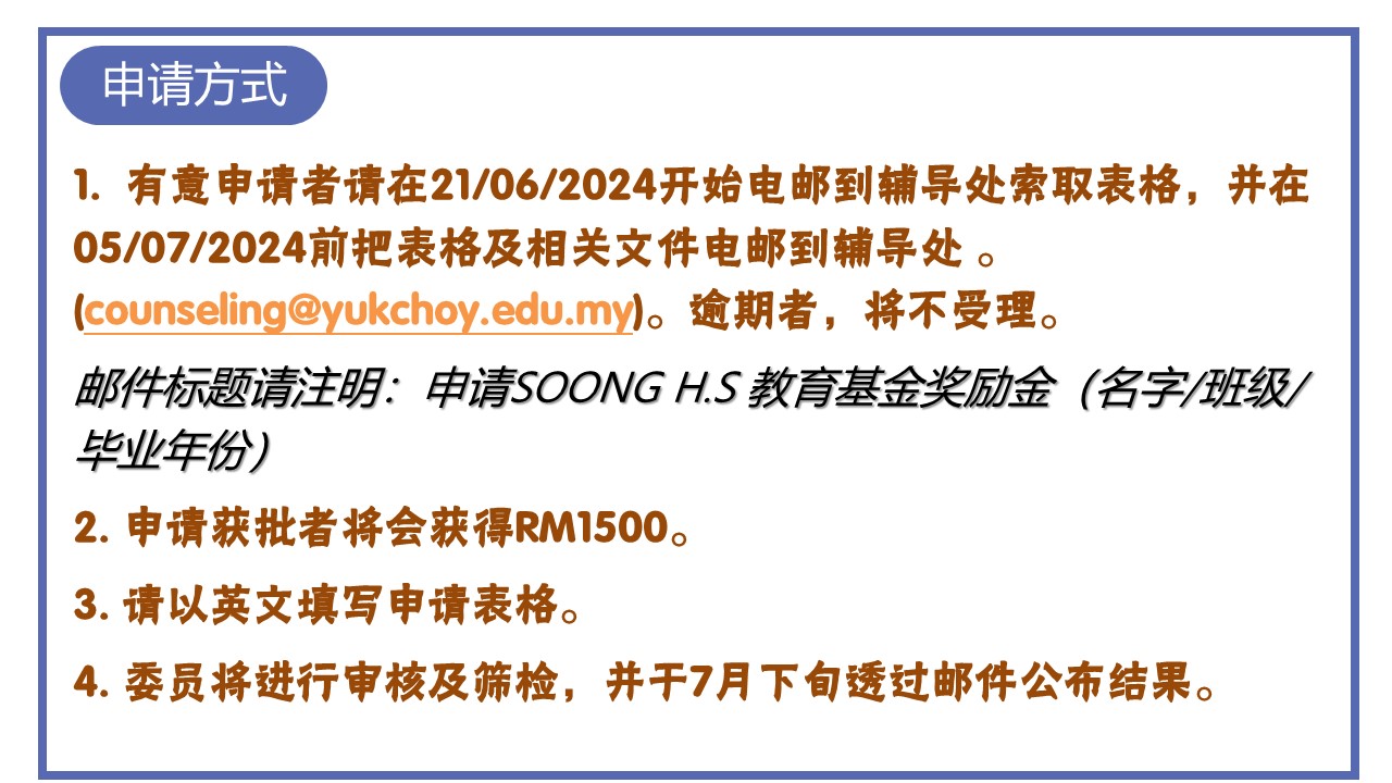 2024年度“Soong HS教育基金”开始接受申请 2024年6月22日发布 2024年度“Soong HS教育基金”已经开始接受申请。凡是符合资格的2023年高三毕业校友,可向辅导处领取申请表格或查询详情。 2024年度“Chong Chee Ming教育基金奖励金”开始接受申请